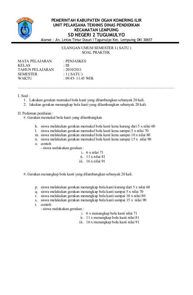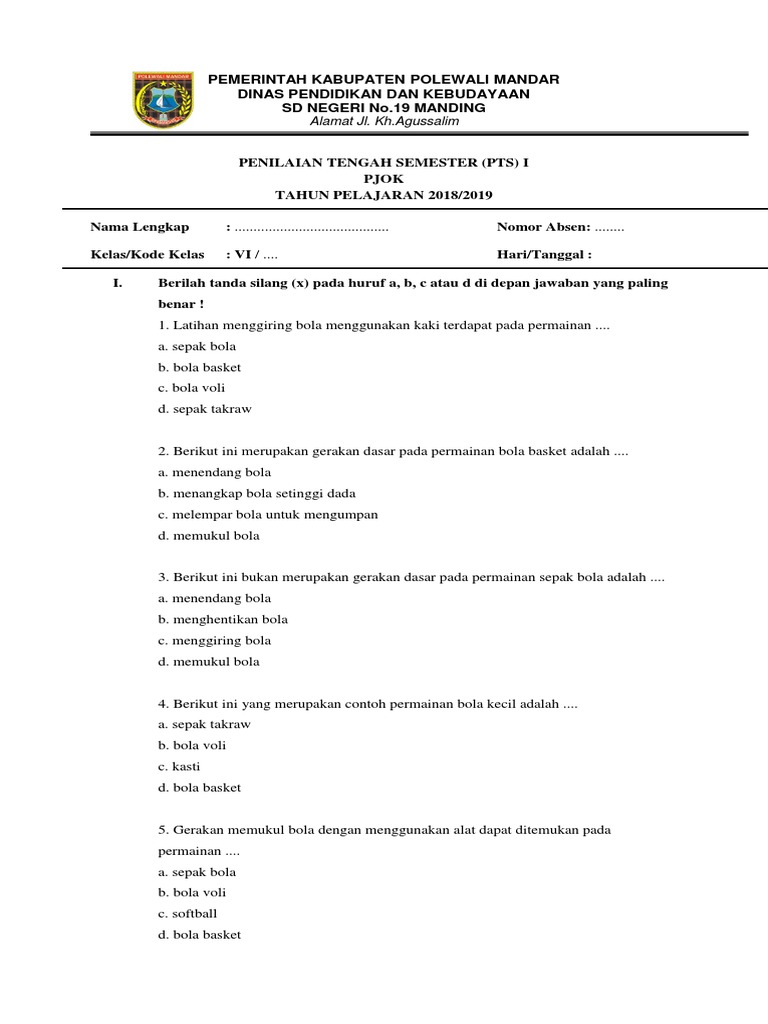 Soal yang dibagikan ini bisa sobat gunakan untuk menambah referensi, maupun sebagai contoh soal pas penjaskes kelas 7 semester 1 untuk bapak/ibu guru kelak.