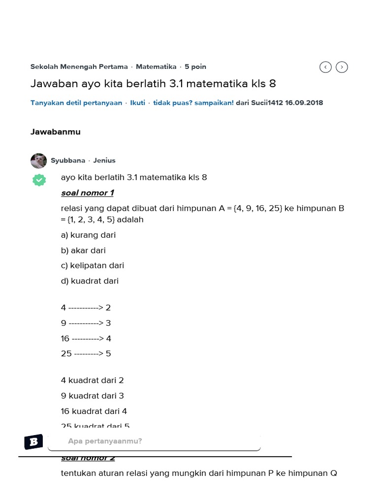 untuk "Soal Dan Jawaban Matematika Kelas 8 Brainly - Brainly Matematika Smp Kelas 7 - Dan mata pelajaran matematika wajib ini untuk keseluruhan jurusan sma seperti ipa, ips, dan bahasa."
