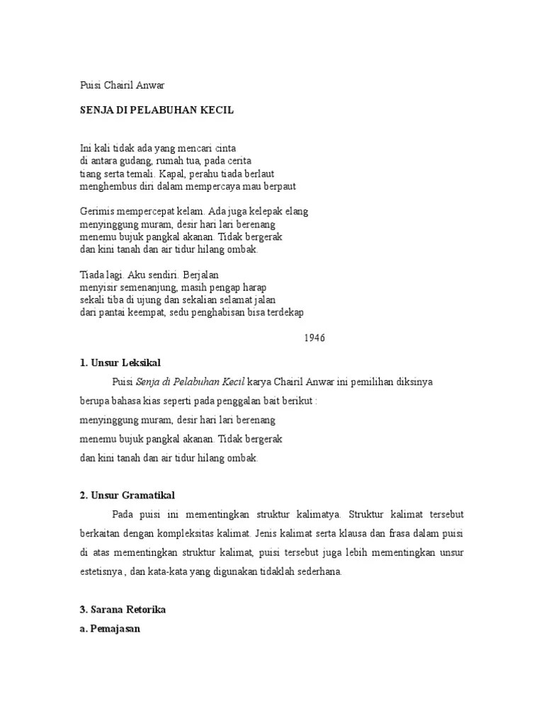 analisis puisi chairil anwar (senja di pelabuhan kecil) rimba amniotik; 2 jadi, pendekatan pragmatik itu melihat dari peranan pembaca dan ingin memperlihatkan kesan dan penerimaan. Didominani oleh vokal bersuara berat a dan u. Karya chairil anwar dengan menggunakan pendekatan mimetik. di dalam puisi karya chairil anwar bertema percintaan.